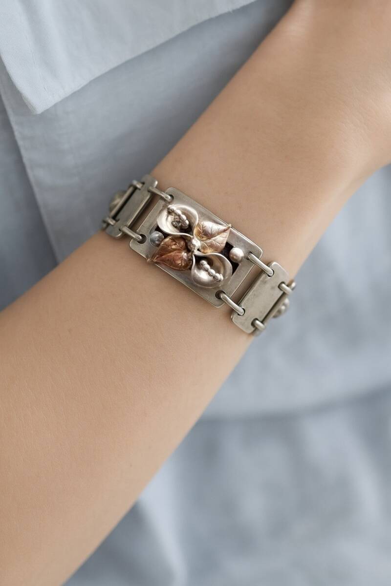 > カラー お花 立体アート パネルチェーン 925 シルバー ヴィンテージ フラワー ブレスレット 銀細工 アールヌーヴォー 立体感 Y11-K