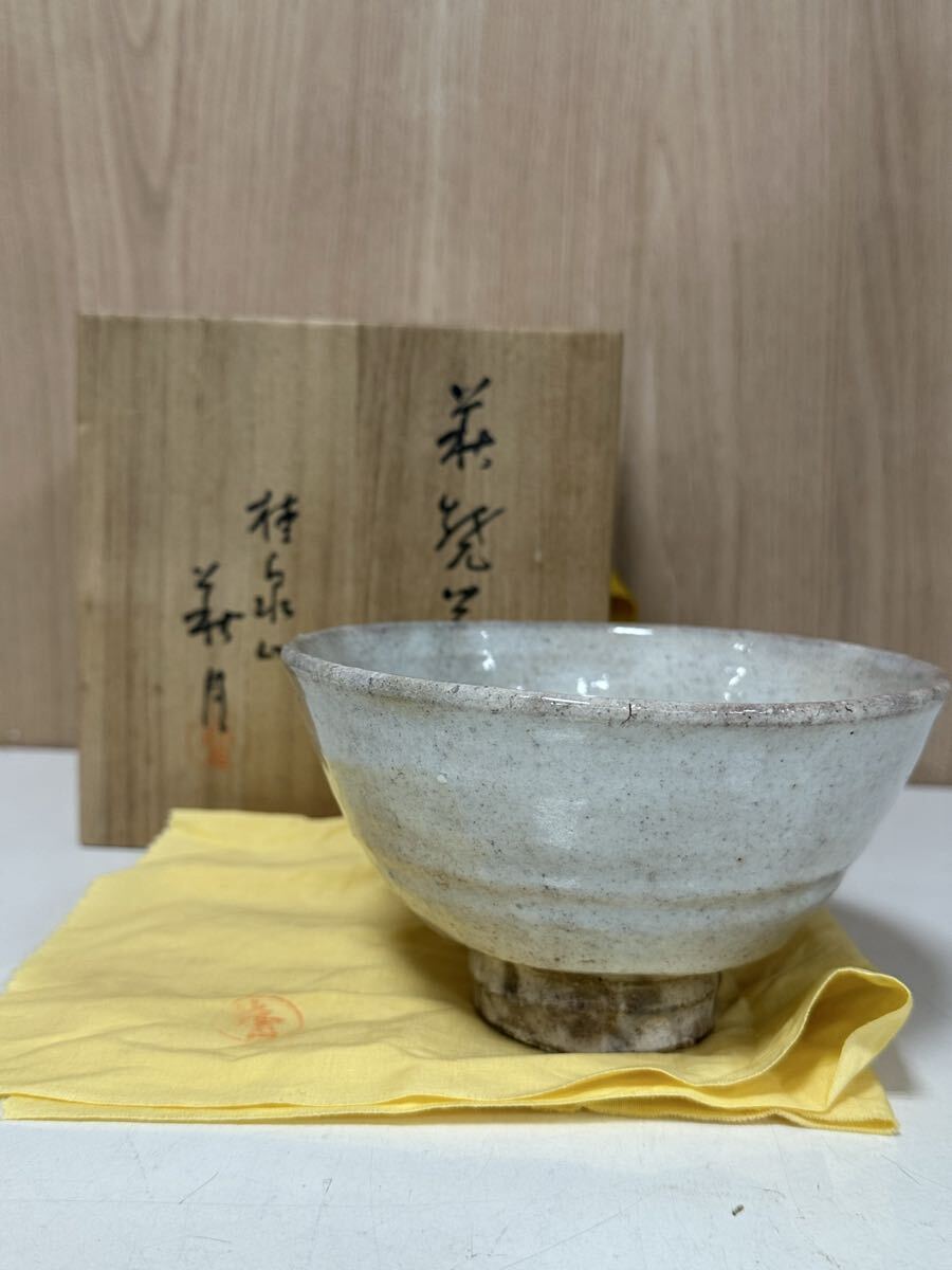 - Y08029 萩焼 茶碗 桂泉山 片山萩月 抹茶碗 陶印 茶道具 共布 共箱 未使用品