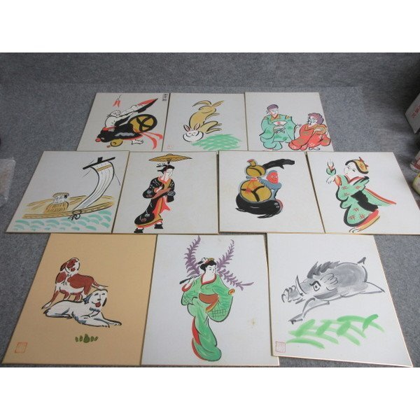 大津絵 藤娘他 色紙 10枚です。寸法(※全ておよそ)は縦27cm、横24cmです。古い物ですので時代なりの小傷やよごれなどがありますが状態は良いと思います。100サイズ、ゆうパックで発送を予定しています。商品画像が実際の商品そのものですので、ご入札前にしっかりとご確認いただきますようお願いいたします。タイトルと画像が異なる場合、当方のミスの可能性がありますので、お手数をおかけしますが、その際にはご連絡いただければ幸いです。また、気になる部分や詳細な画像が必要な場合は、質問からお気軽にご連絡ください。配送方法については、通常の配送にはゆうパックやクロネコヤマトを利用します。大型商品や重量のある商品には、西濃運輸、佐川急便を選択することがあります。軽量で壊れにくい小物には、クリックポストやレターパックを利用することもあります。同梱の場合は送料が変わることがある点、ご了承ください。商品の写真はデジタルカメラや照明、撮影環境により実物の色と異なる場合があります。「真作」とタイトルにある商品について、万が一真作でない際には返品を受けます。中古商品であるため、記載しきれない経年劣化や時代の汚れ、傷みなどがある場合がございます。十分なご理解をいただいた上で、ご入札いただけますと幸いです。皆様のご入札を心よりお待ちしております。他にも色々出品中ですので是非ご覧ください。