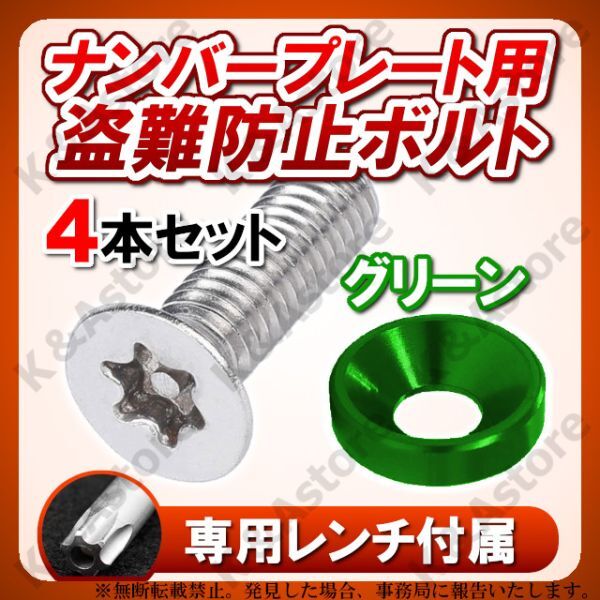 - ナンバープレート ロック ボルト グリーン 盗難防止 ステンレス トルクスネジ アルミ ワッシャー カラー セキュリティ 車 バイク カスタム