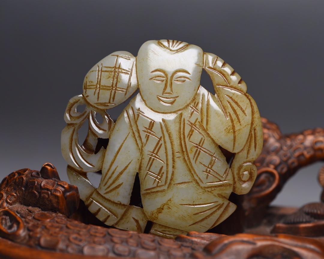 - 唐物 清 玉彫 和田玉 童子 玉質温潤細膩 沁色自然 包漿一流 極細工 中国古玩 骨董品 古美味 D68