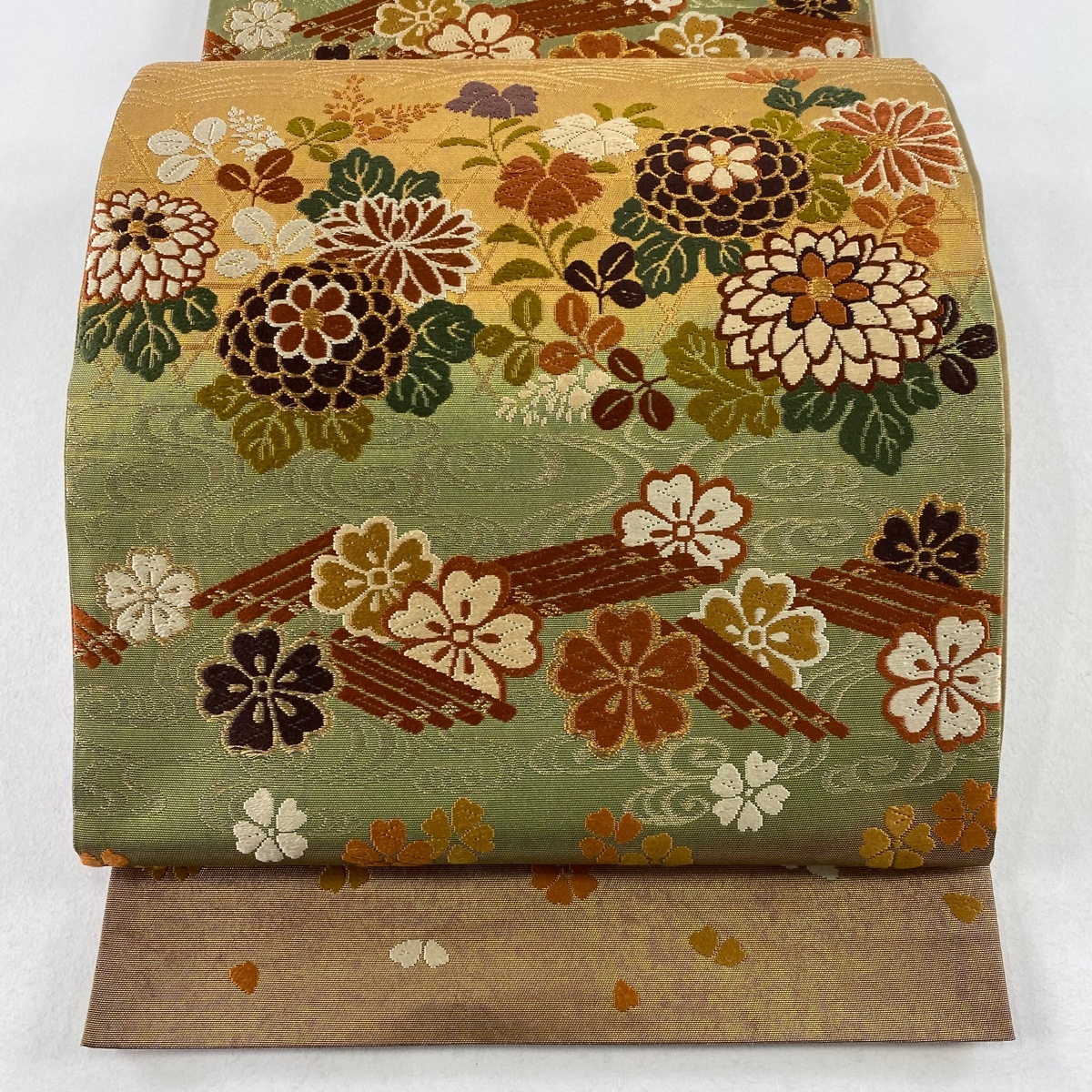 - 袋帯 秀品 花筏 流水 金糸 唐織 金茶 六通 正絹 【中古】