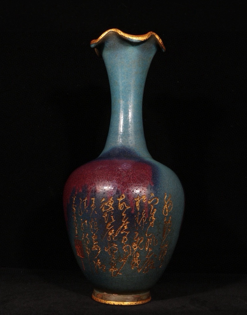 - 時代旧蔵 宋時代 鈞窯 包金刻字 花口瓶 古陶磁器 高さ32 cm 直径14.5 cm 珍品旧蔵 古賞物 時代物 819