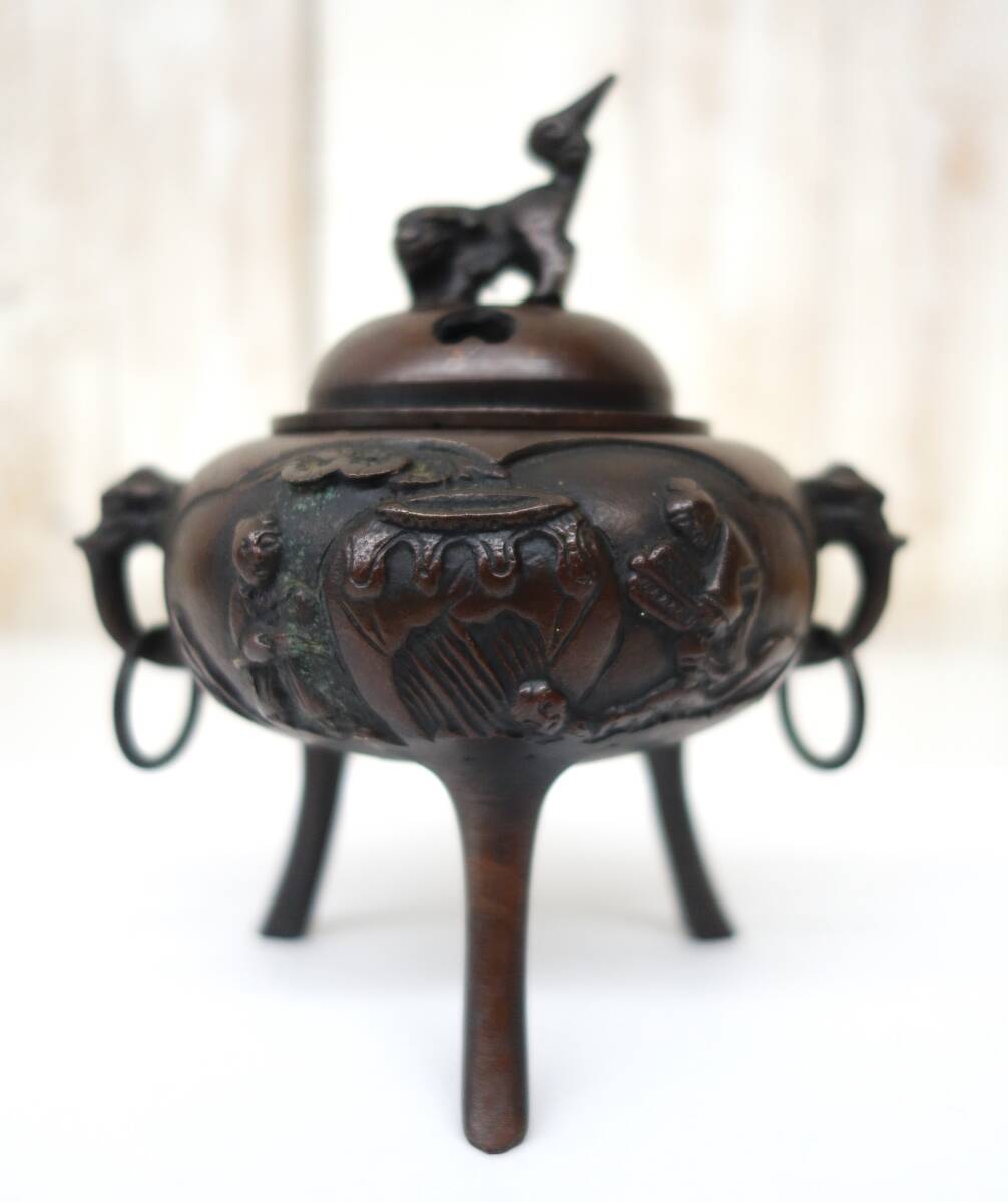 - 伝統工芸 工芸美術 時代 高級仏具 仏壇 仏具 *銅香炉 三足高足香炉 丸香炉 置香炉 銅器 *獣双耳 遊環 盛上彫刻 獅子摘蓋