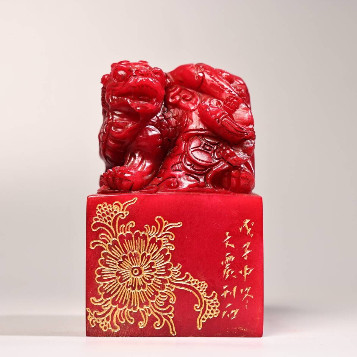 - 蔵友旧蔵出 寿山石 紅田黄石 細密彫 描金 神獣印章 貴重品 稀少物品 置物 賞物 中国時代美術品