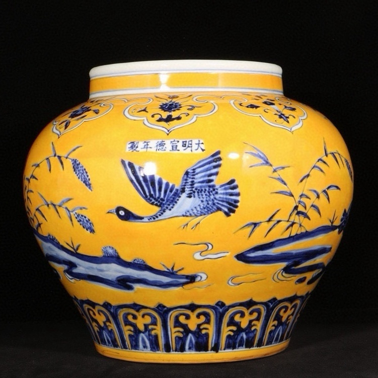 - 秘藏 明時代 宣徳年制 黄地青と白 飛鳴宿食紋缶 時代物 汝窯 唐物 陶磁器 中国美術 高さ31 cm 直径32 cm 古物保証 820