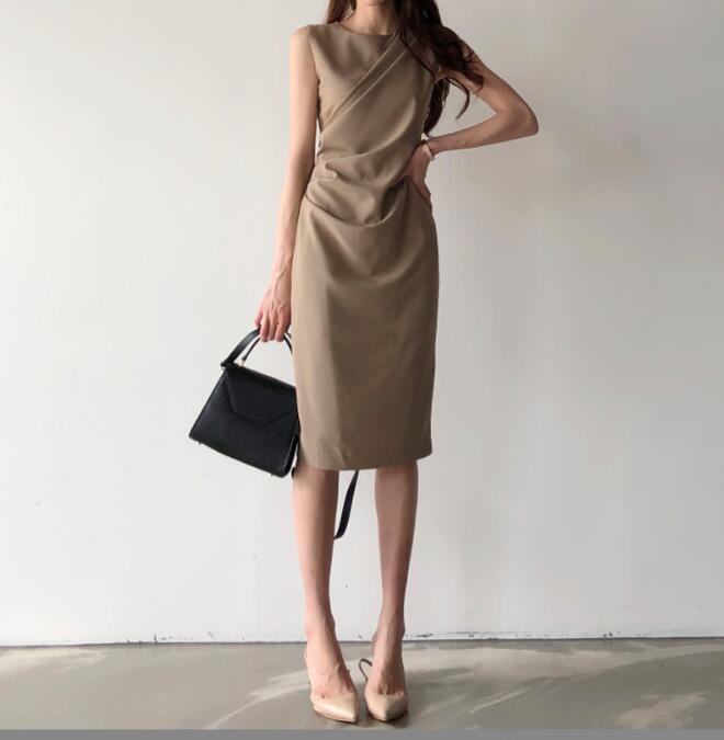 - 新作上品 きれいめ ワンピース フロントクロス ノースリーブ ドレス シンプル エレガント ブラウン