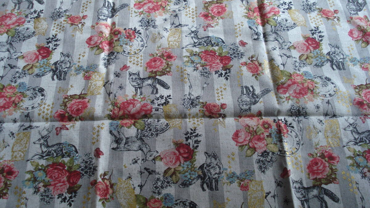 - ラスト◆麻混 ストライプアニマル キツネ・シカ・バラなど(シルバーグレー系)約50㎝×約50㎝/廃番