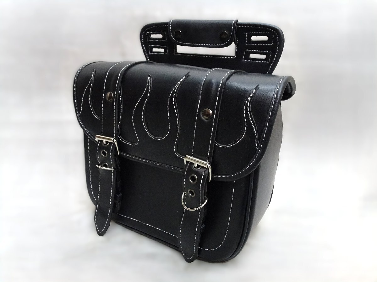 > NEWデザイン!! バイク用サイドバッグ フレイム FLAME ホワイトステッチ シングル 6Lサイズ 黒 BLACK サドルバッグ バイク用