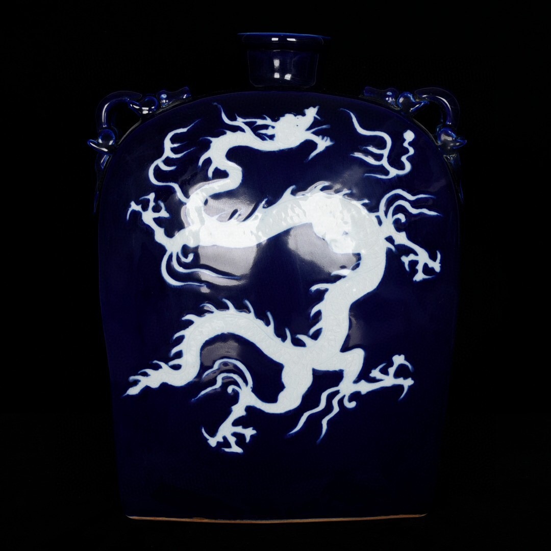 - 『元・古陶瓷品・霽藍釉・留白・云龍紋・扁瓶・染付・唐物』極細工 置物古賞物 中国古玩 中国古美術