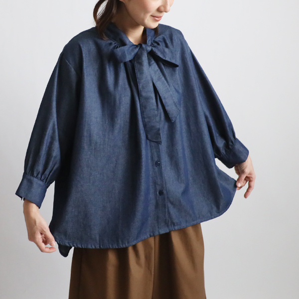 - 甘織デニム ボウタイ リボンタイ 燕尾裾ブラウス シャツ 八分袖 前開き 羽織りもの コットン H52