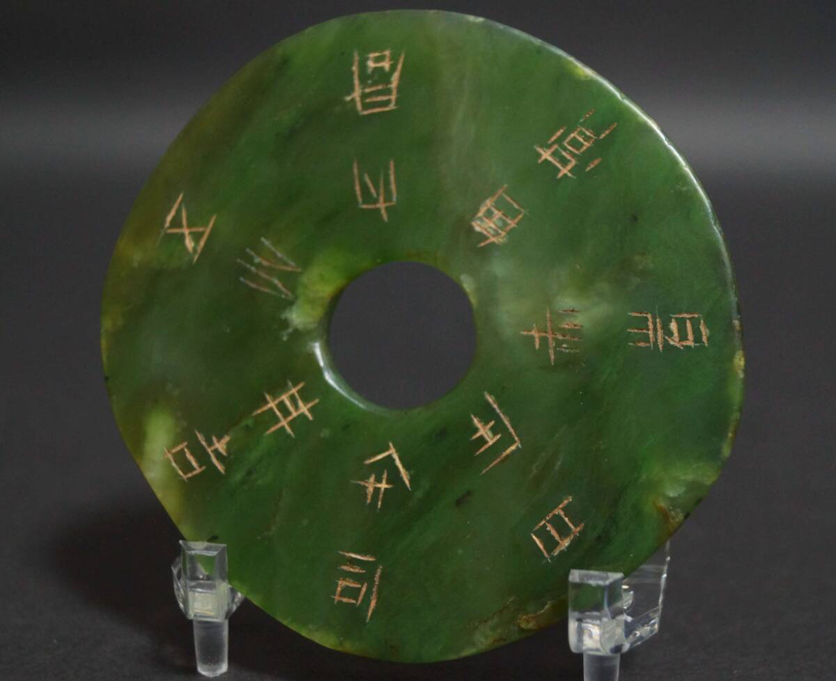 - 【閑】古玉 和田玉(ホータン) 和田青玉 文字彫り 根付 緒締玉 玉佩 提げ物 装飾品 幅7.2㎝☆美しい石目☆時代物☆7D0821