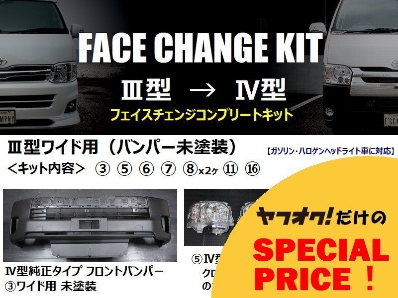 > ● ハイエース 200系 ワイドボディ [3型 → 4型] フェイスチェンジキット ディスチャージ対応 バンパー未塗装 S-GL ワゴンGL ワゴンDX