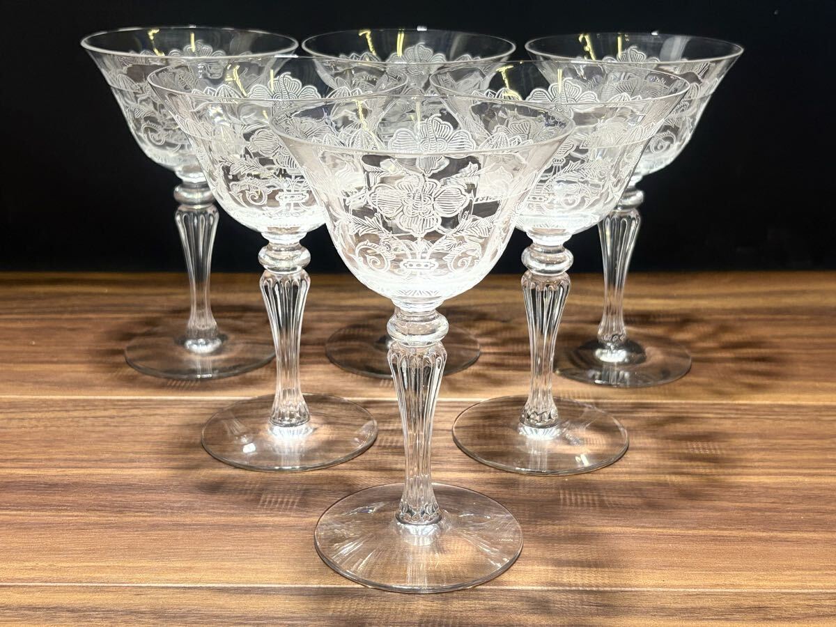 > 【6個まとめ】Tiffin Crystal ティフィンクリスタル カクテル シャンパングラス エッチング加工 ビンテージ コレクション 【管B965-2508】