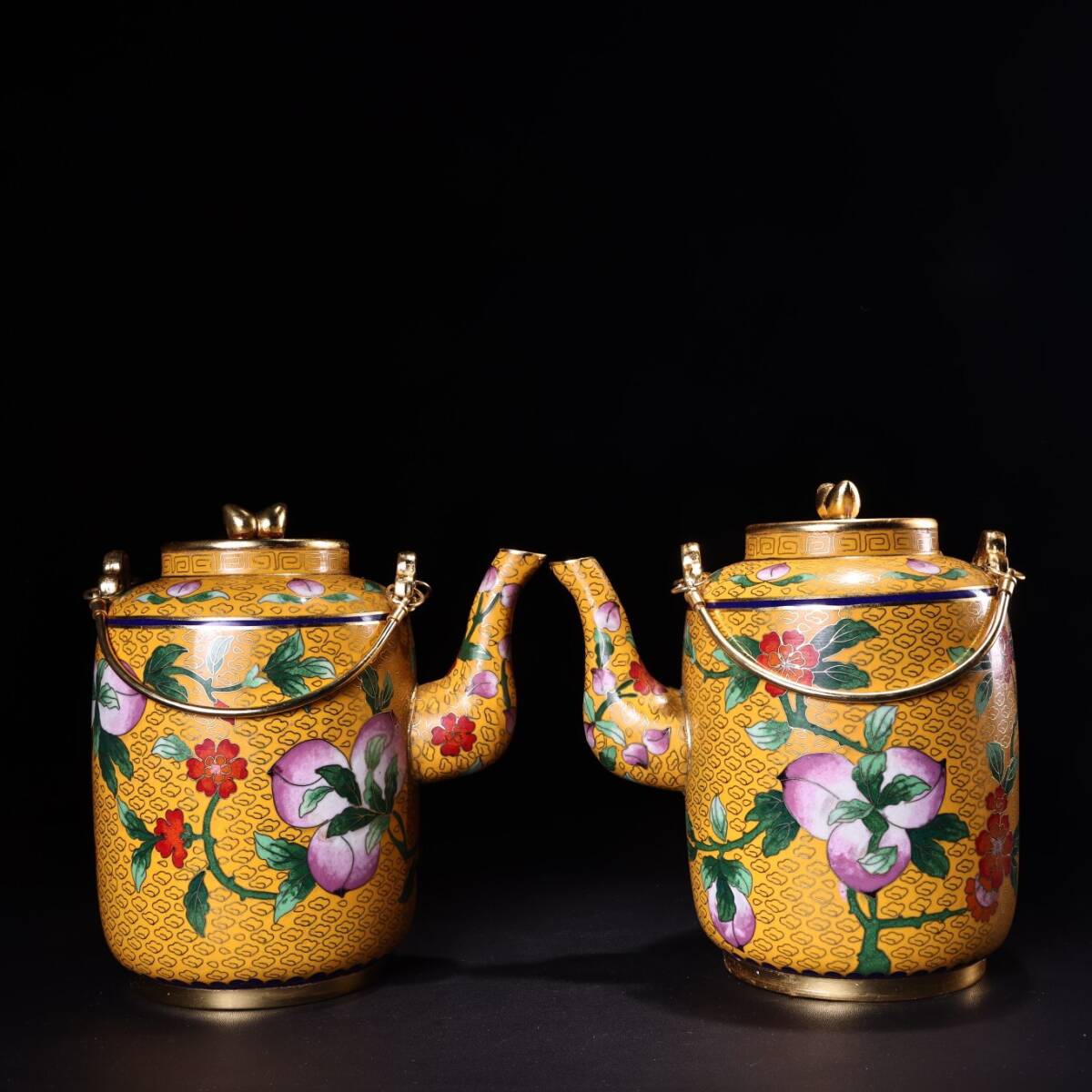 - ▽鴻▽ 銅製 景泰藍 琺瑯彩 寿桃紋 提梁茶壺一對 置物 賞物 古賞物 古董品 時代物 稀少珍品 中国古玩 中国古美術