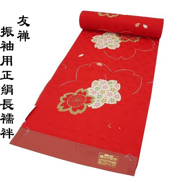 - 振袖用 正絹 長襦袢 友禅染 j-186 送料無料 反物 赤 レッド 振袖 成人式 友禅染め 桜 さくら