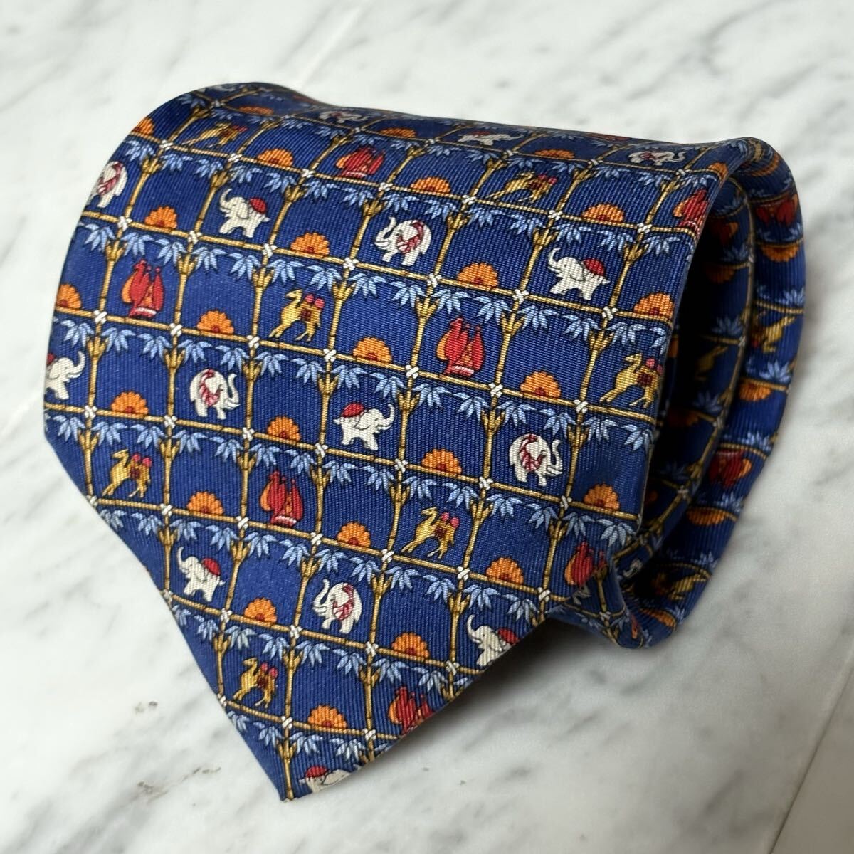 - 999円~ Ferragamo ネクタイ ネイビー 動物柄 ブロックチェック柄 (B14)