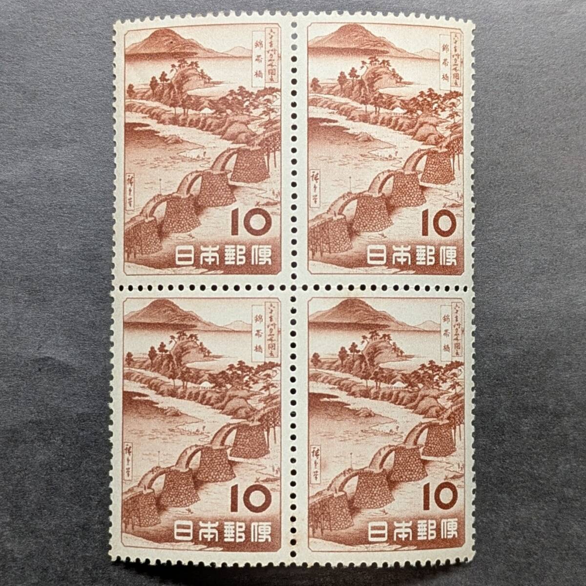 - 観光地百選シリーズ 10円切手4枚ブロック 錦帯橋◆広重の版画◆1953年◆未使用◆並品
