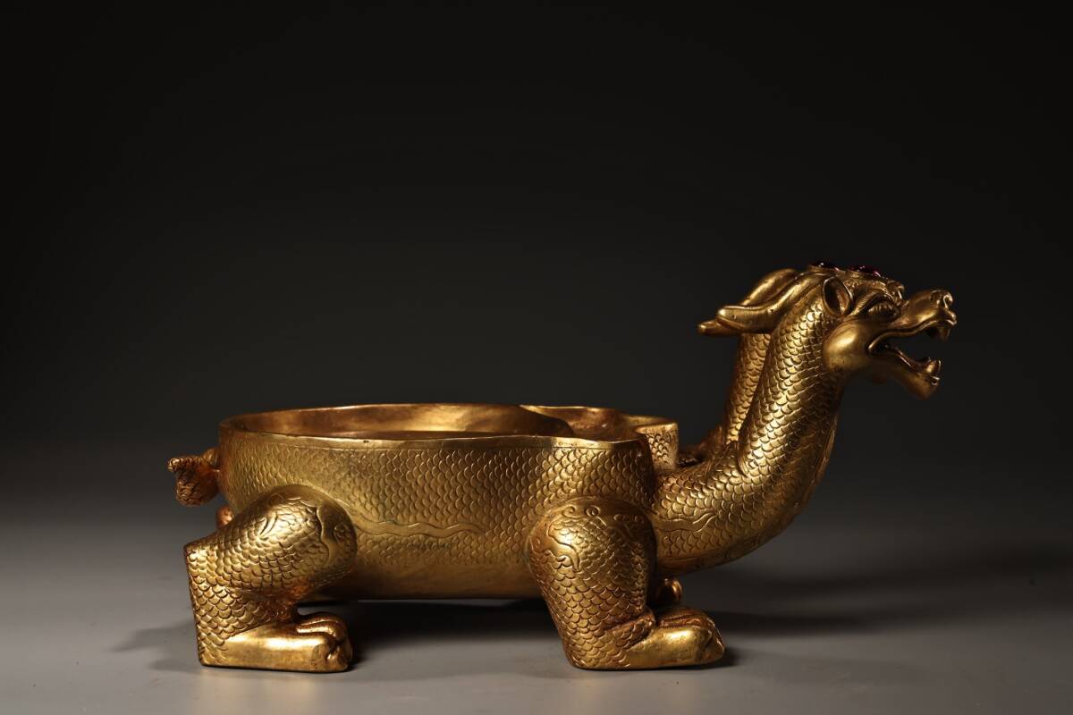 - 『清・銅製・塗金・雙頭龍龜硯台・置物・賞物』極細工 置物 古賞物 中国古玩 中国古美術