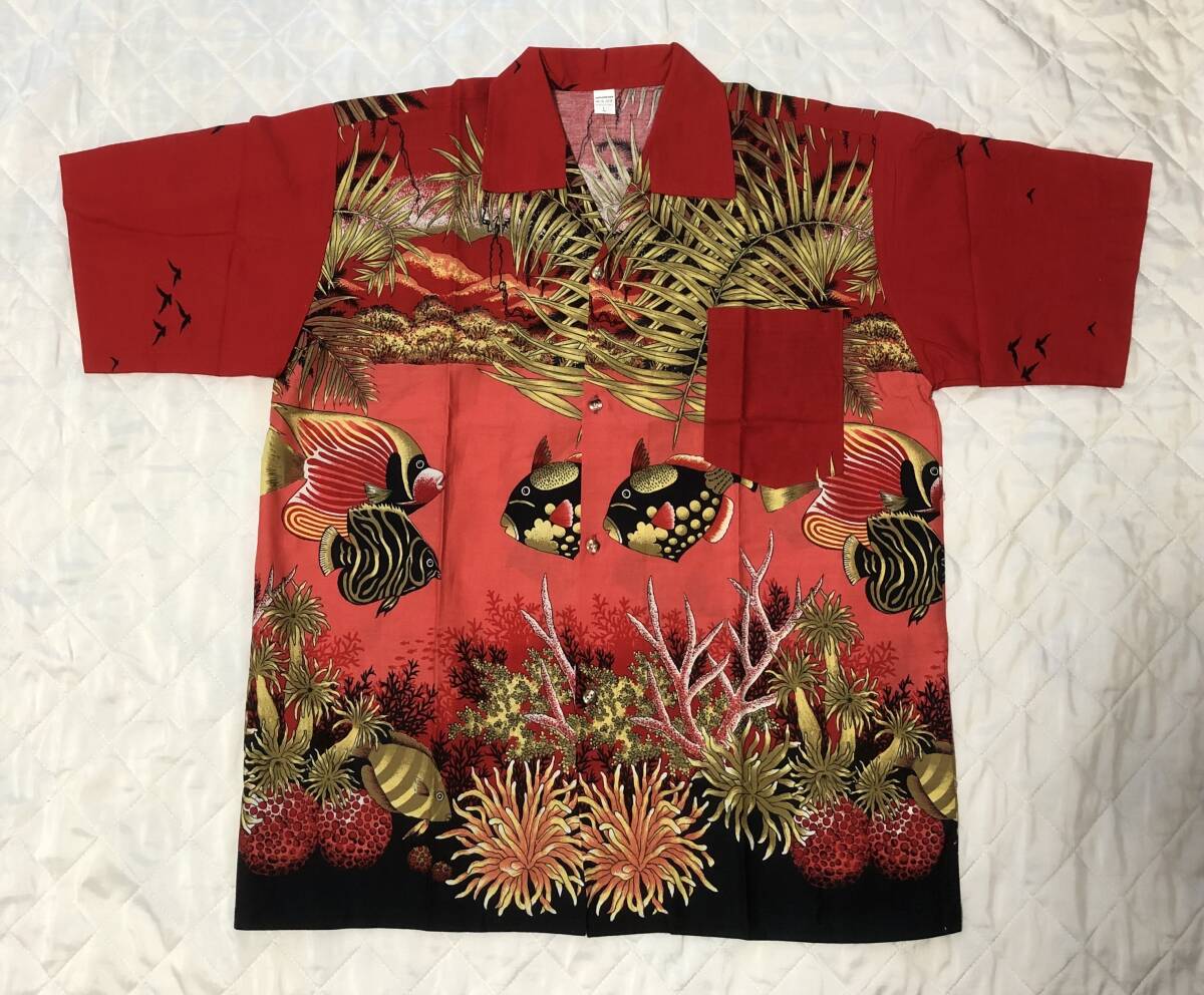 - ☆開襟シャツ☆半袖☆アロハ☆赤系☆珍しい柄☆Lサイズ