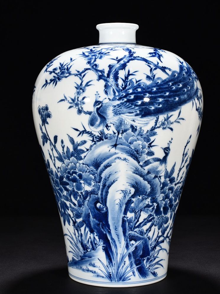 - TD121■大清雍正年製 款 青花孔雀花鳥紋梅瓶 収蔵品 古玩 唐物 古陶磁器■