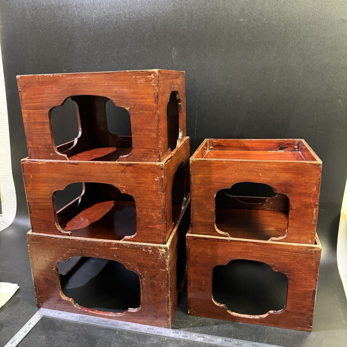 - 木製 お膳台 漆器 工芸品 足付き塗り膳 5脚セット まとめ 入れ子 レトロ セット 重ね膳 入れ子膳 5段 御膳 懐石