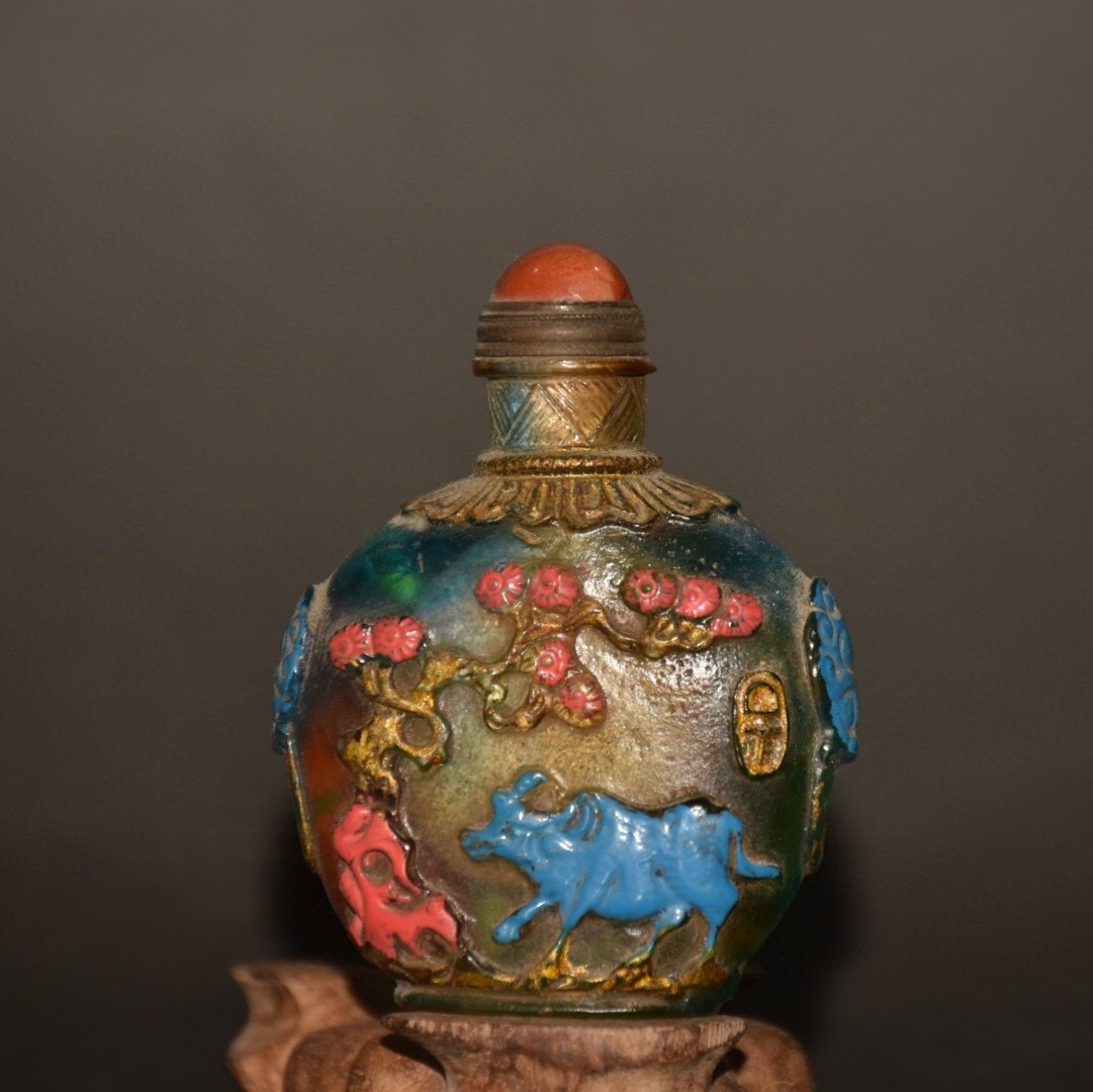 - 【超珍館蔵】琉璃製 細密彫 描金 彩繪 生肖牛紋 鼻煙壺 根付 裝身具 古賞物 古董品 古美術品 時代物 旧家蔵出 稀少珍蔵品
