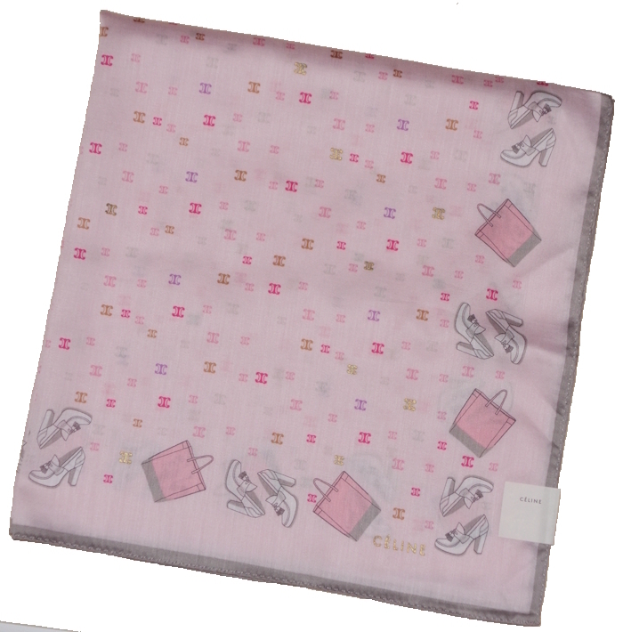 - CELINE/セリーヌ★大判ハンカチ/スカーフ 58x58㎝★マカタムxバックxシューズ柄★ピンクxグレー★日本製