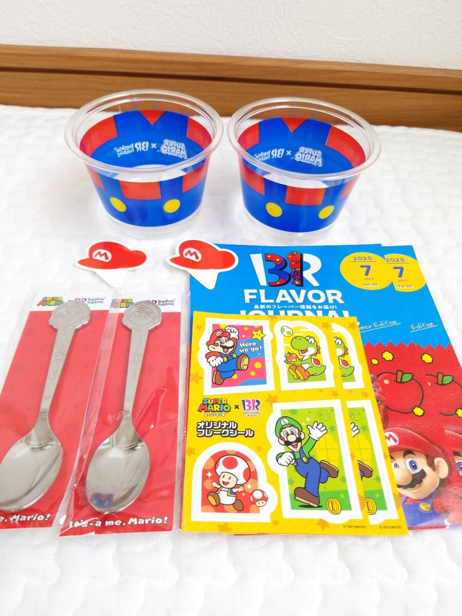 > ☆新品サーティワン×スーパーマリオコラボ限定マリオスプーン2本&フレークシール2枚setスペシャルダブルカップ&ピック&冊子付きレア☆