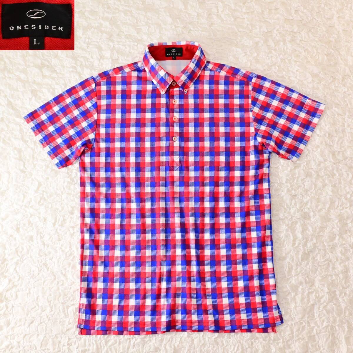 - O5 Men L つるやゴルフ ONE SIDER 赤青チェック柄 半袖プルオーバー
