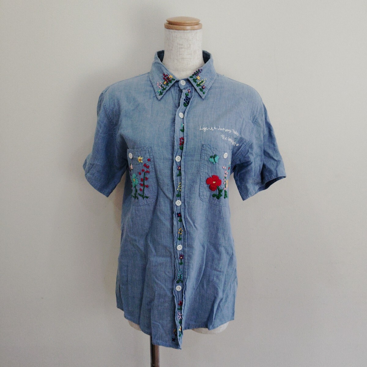 - 0826/M/H.R.MARKET レディース 半袖シャツワンピース デニムシャツ 刺繍 花柄 ブルー