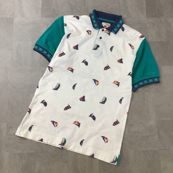 > CUTTER & BUCK カッター&バック 総柄 ヨット柄 半袖 ポロシャツ メンズ Sサイズ ホワイト エメラルド ゴルフ golf