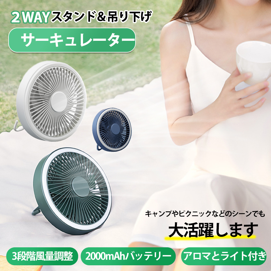 - 落札後カラー提示×2WAYサーキュレーター 扇風機 首振り静音 スタンド吊り下げアロマ機能、キャンプライト付き風量3段階調節省エネqs-210