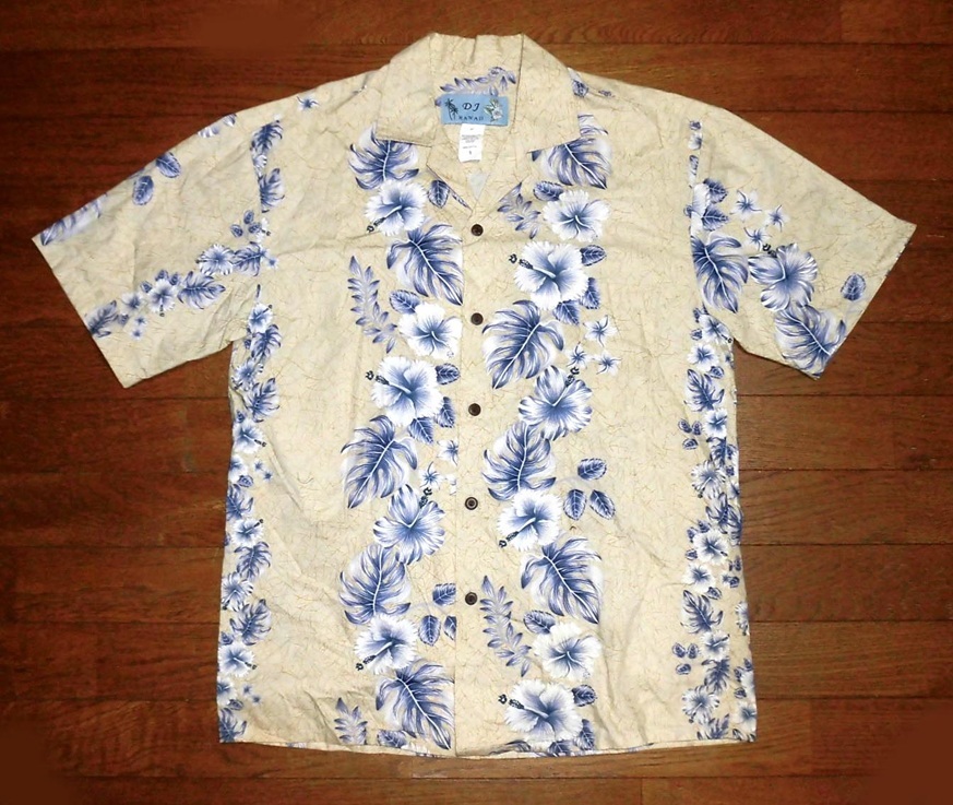 > DJ HAWAII ディージェー ハワイ アロハシャツ コットン 半袖 ハイビスカス柄 ハワイアンシャツ ココナッツボタン BEG S 使用僅 美品