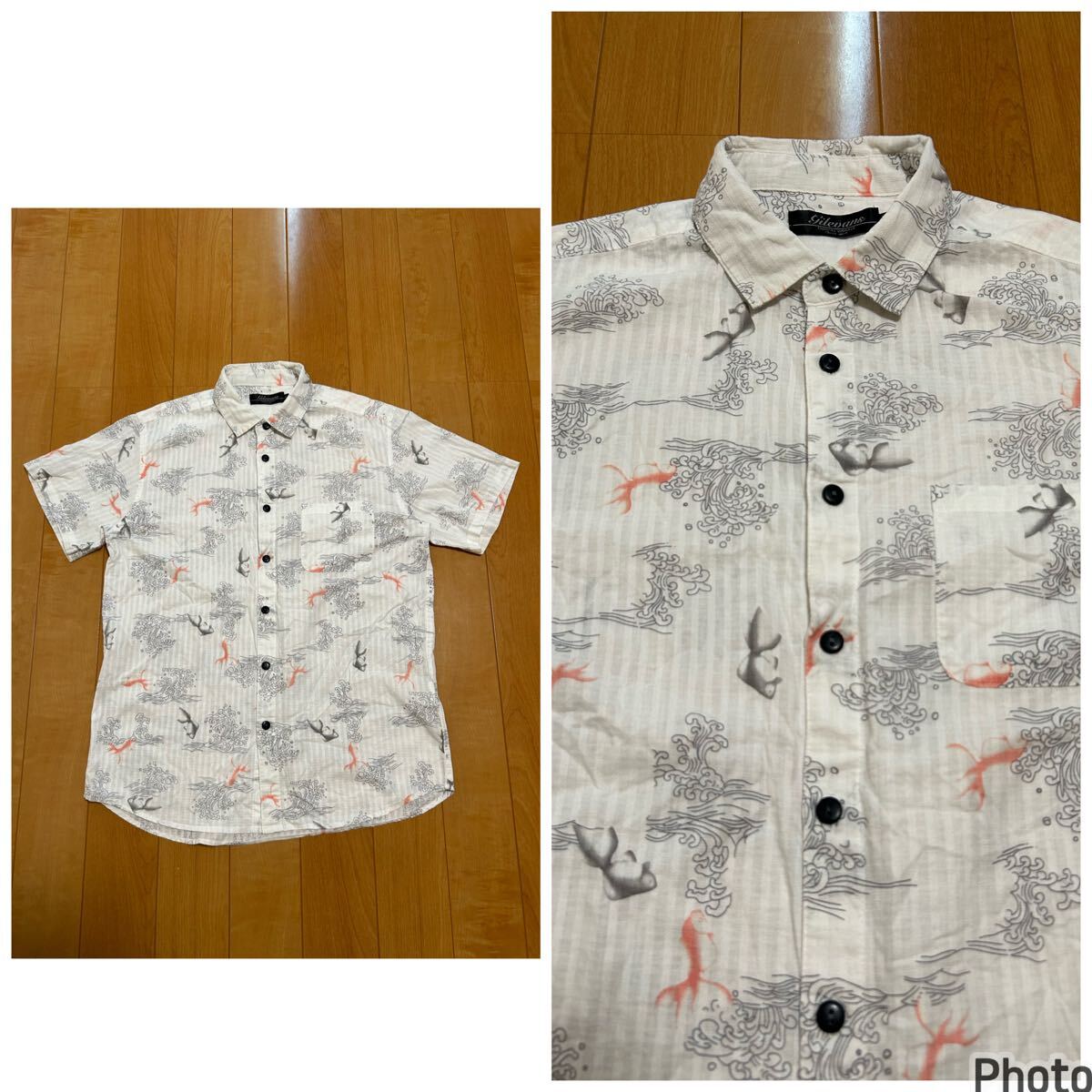 > 良品☆GILEVANS/和柄 サイズL ストライプ織り柄入生地.半袖シャツ型アロハシャツ 金魚&波総柄 白色 Japanese pattern-SHT スカジャン調