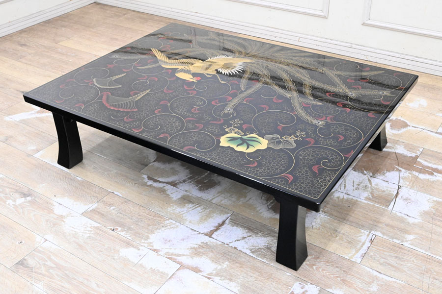 - E013 輪島塗 沈金 鳳凰 座卓 座敷机 ローテーブル 黒漆 和家具