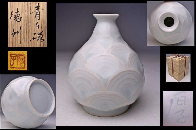 - 久保田厚子 ★ 青白磁 徳利 ★ 共箱 共布 ★ 上作 ★ 酒器 ★ 面取 ★ 東京芸大 ★ 美しい青白磁に 繊細な波模様が 美しい 逸品 ★