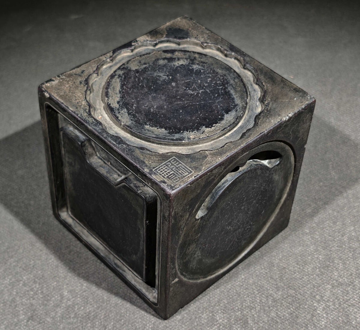 - 【瓏】老坑端石彫 六面正方形文房端渓硯 張謇銘 清時代 手彫り 文房四寶 書道具 中国古硯 古美術 蔵出