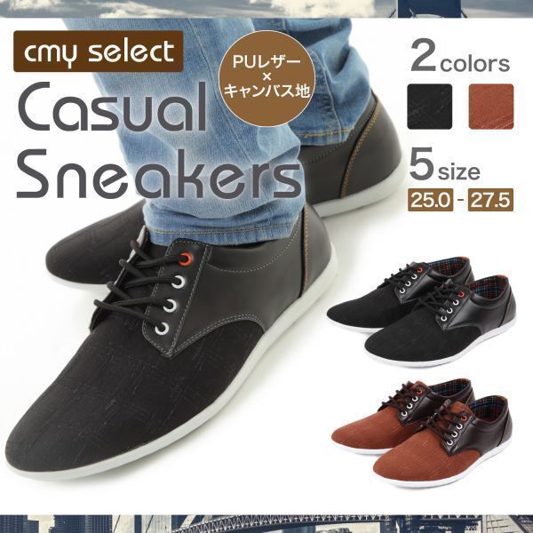 - スニーカー メンズ カジュアル PUレザー キャンバス地 チェック柄 ブラウン 25.5cm 訳アリ 展示品