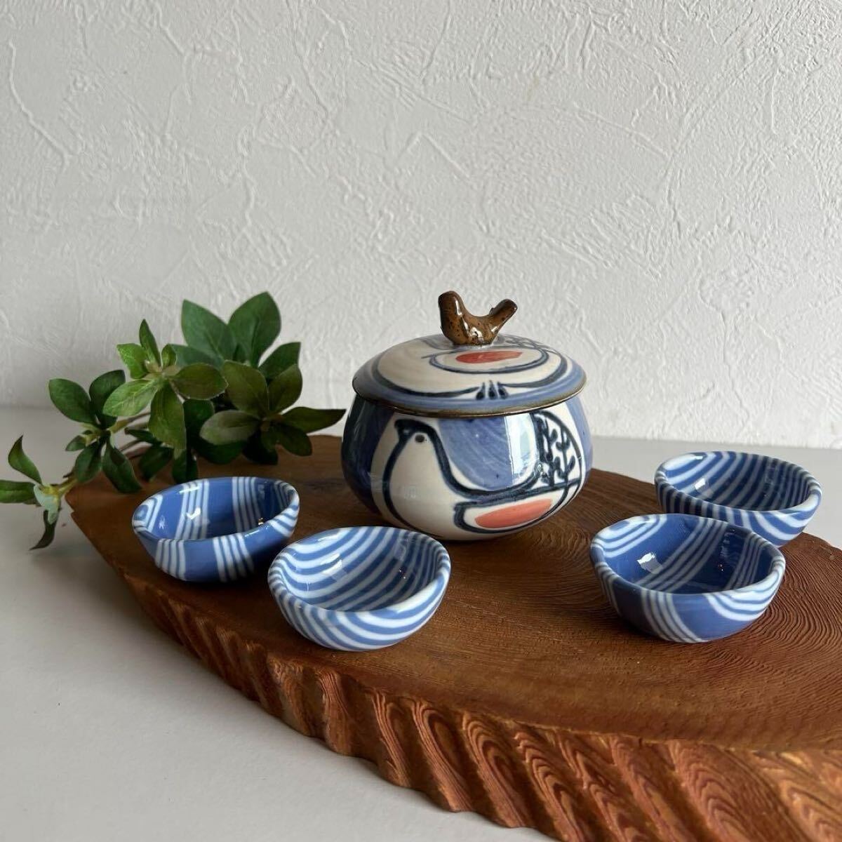 > wasabi k806 和洋に使える 鳥の蓋付き小鉢・縞文豆皿 4枚(柄2種類)鳥の形のつまみが可愛らしくシュガーポットとしての利用もオススメです