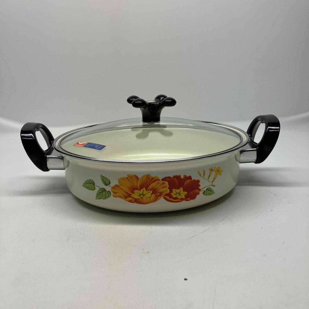 > 東京アルミニウム COOK WARE クック ウエア ホーロー 琺瑯 両手鍋 浅鍋 調理器具 鍋 硝子蓋 花柄 レトロ 昭和