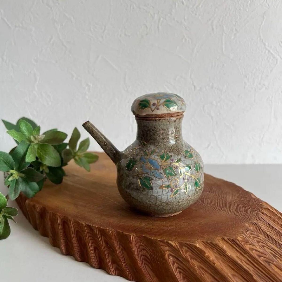 > wasabi k808 和の食卓 貫入釉の醤油差し 草花文様 ベージュ系 高さ10㎝ やきもの 和食器 調味料入れ 味わい深い貫入に花絵が映える逸品