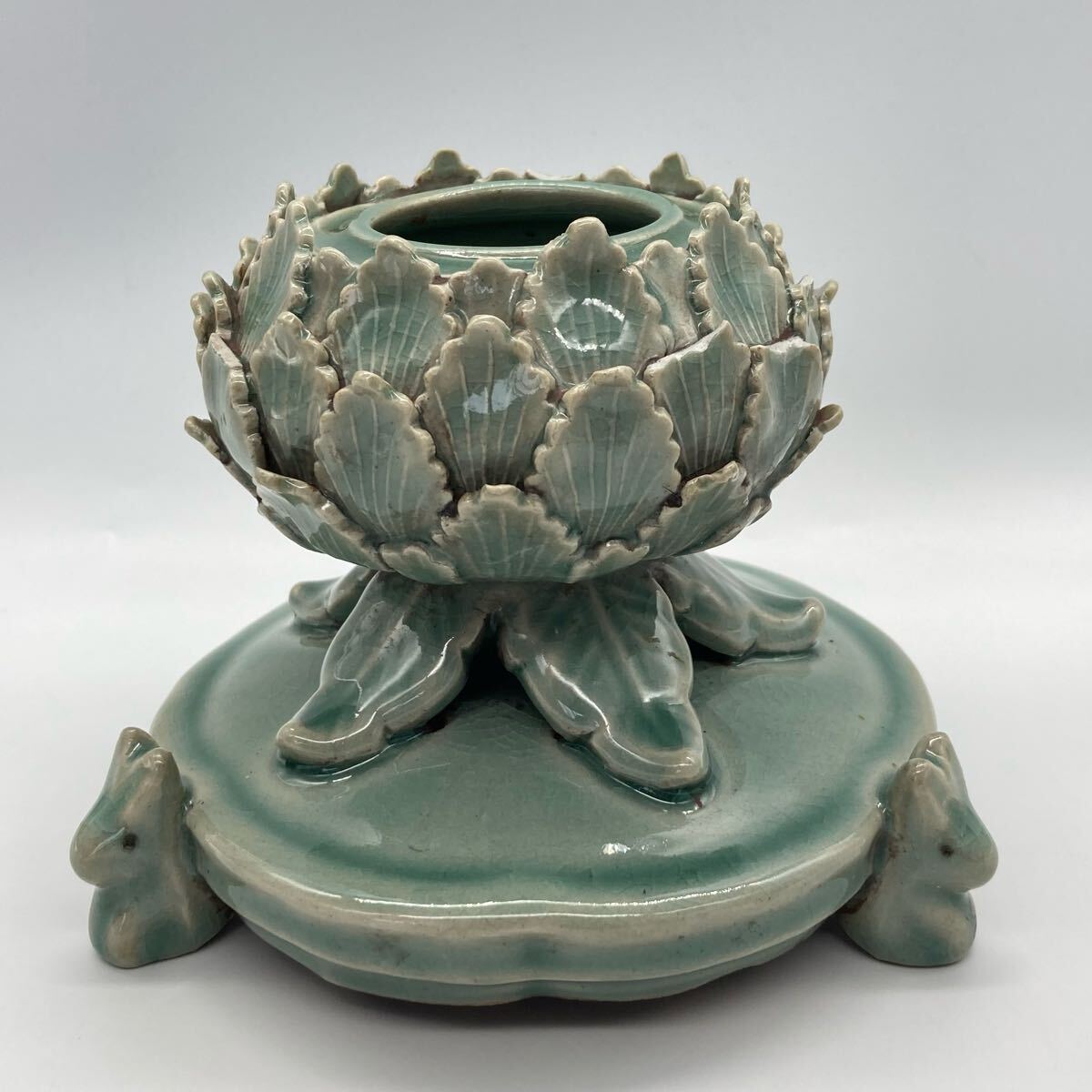 - M0829706B 高麗青磁 海青 蓮香炉 三兎足 香炉 蓮華兎三脚 青磁 韓国 工芸品 陶芸 置物 オブジェ インテリア 当時物 中古品 現状品