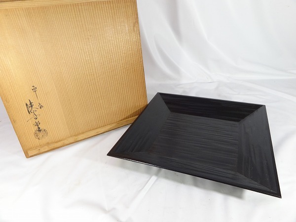 - 8Wh/4-8 岡本漆専堂 黒一閑塗 四方盆 菓子盆 菓子器 茶道具 共箱