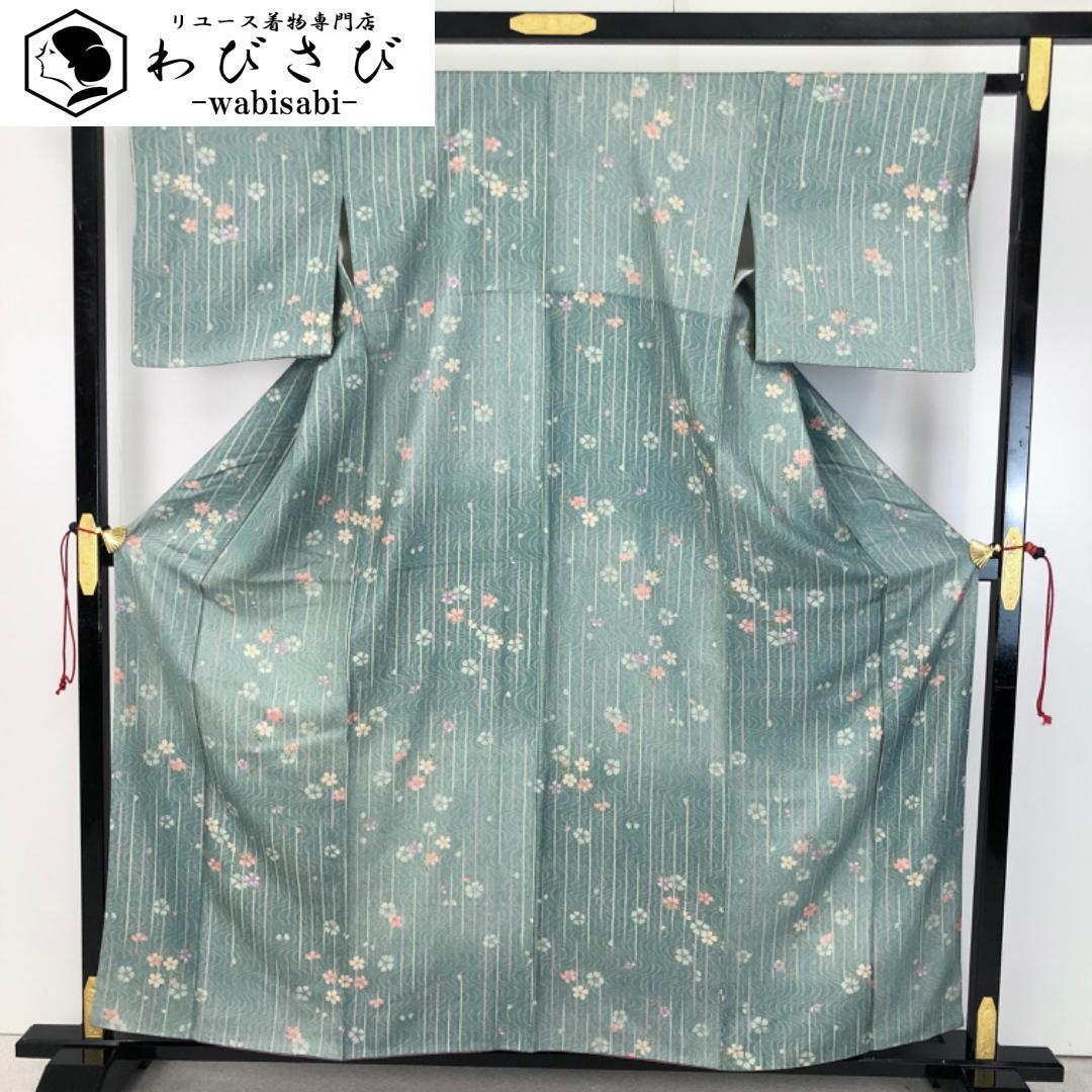 > 小紋 流水に花模様 縦縞 深川鼠色 金彩 K-5154 着物 きもの kimono 和服 和装 中古 リサイクル着物 【送料無料】