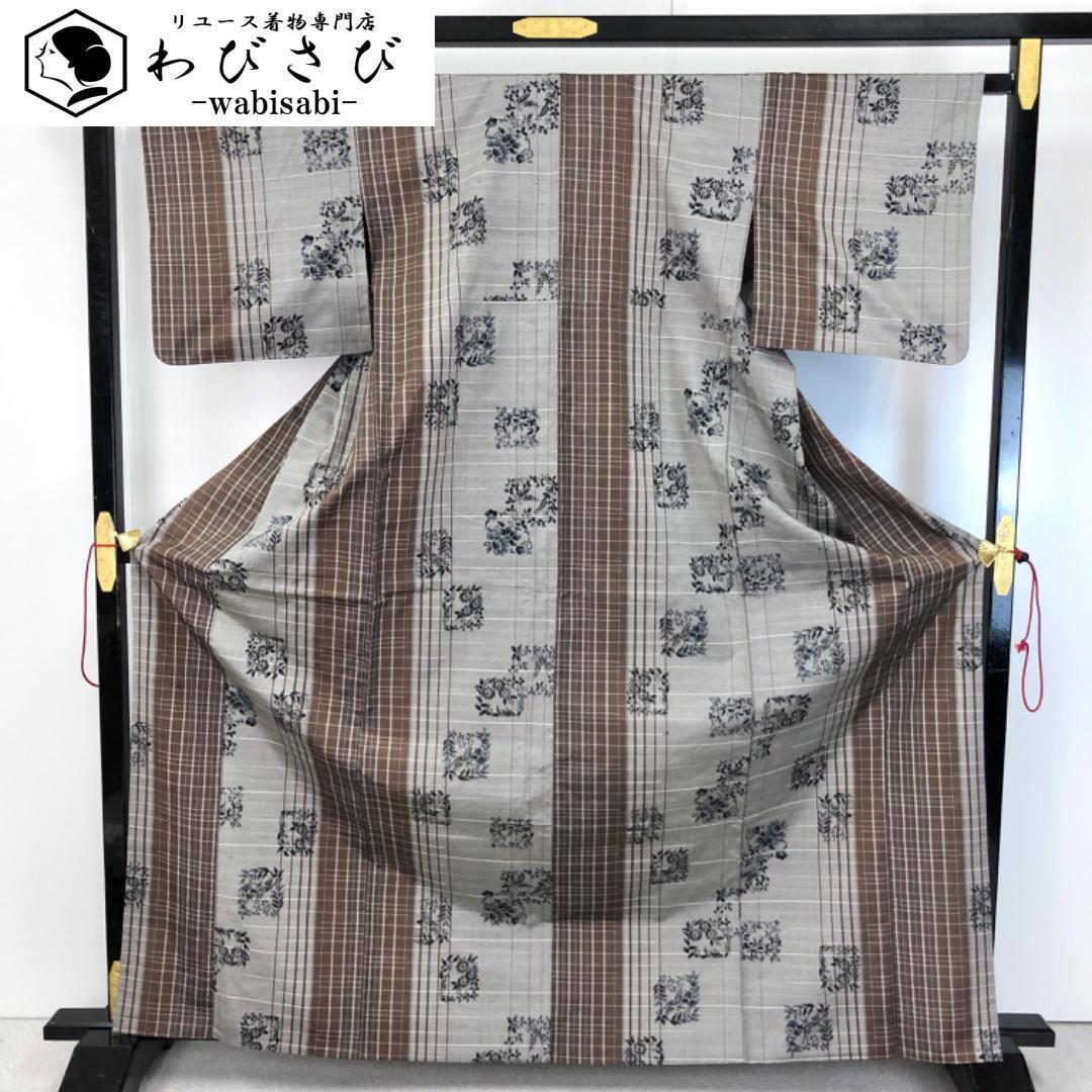 > 単衣 紬着物 格子柄 花柄模様 錫色 K-5160 着物 きもの kimono 和服 和装 中古 リサイクル着物 【送料無料】