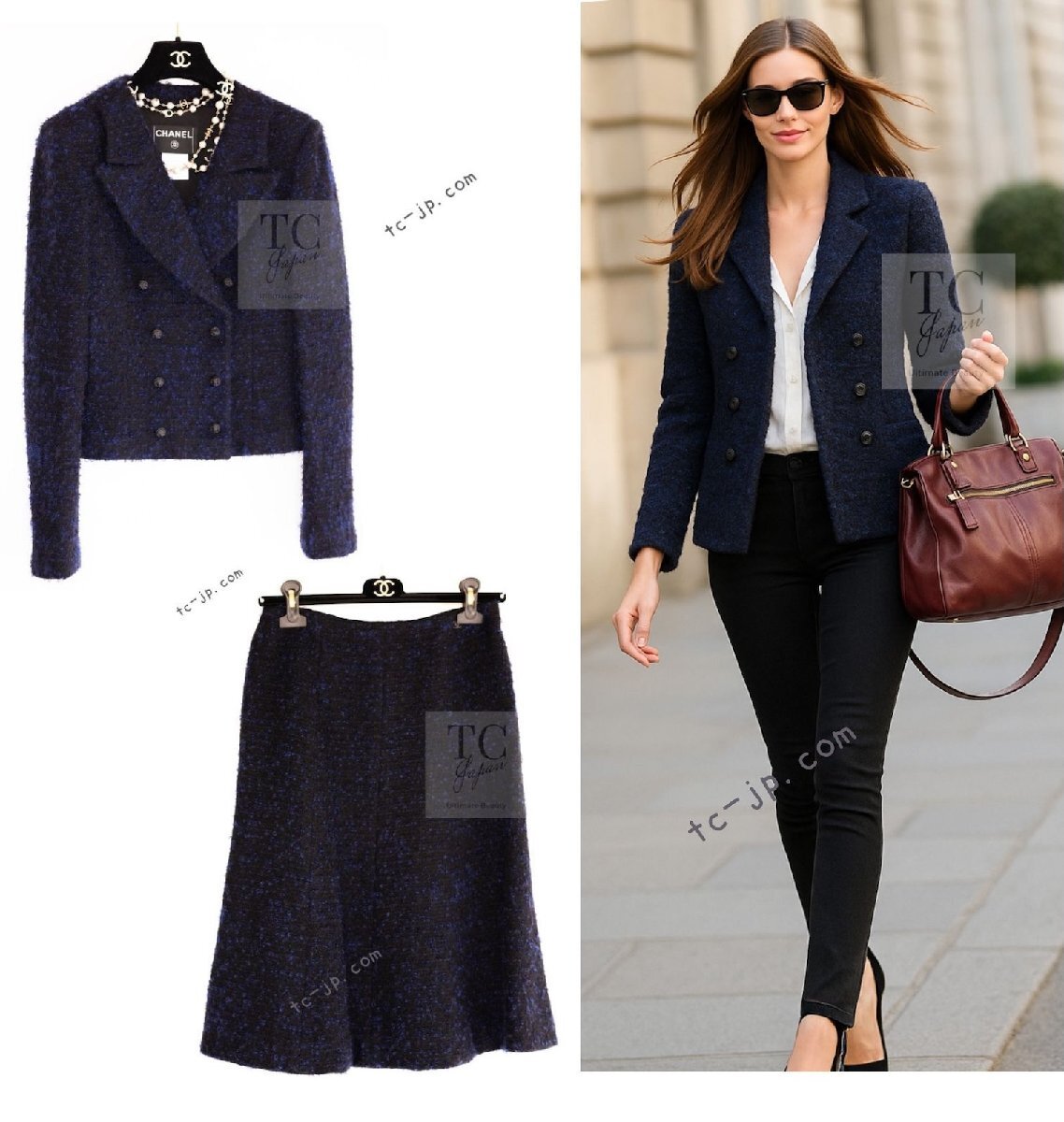 > シャネル ジャケット スーツ CHANEL ブラック ブルー ウール モヘア ダブル ツイード スカート カール・ラガーフェルド 貴重 超美品 38