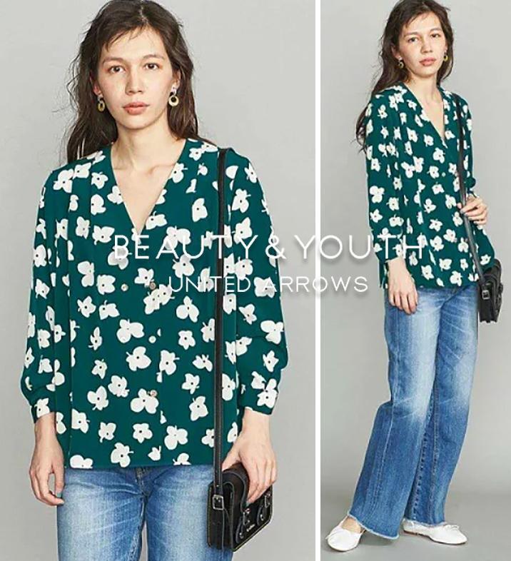 - 全国送料230円*ユナイテッドアローズB&U/落ち感2WAYバイカラーフラワープリントブラウス グリーン系