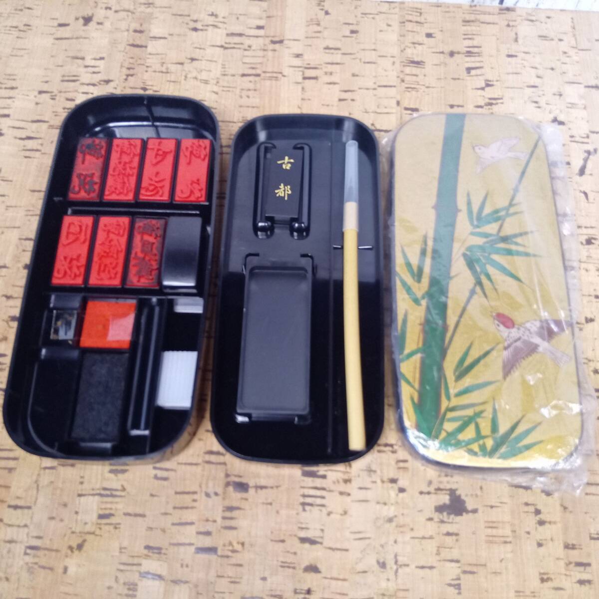 - すずり箱 プラスチック 蒔絵風 毛筆 墨 硯セット 祝儀用スタンプ付き