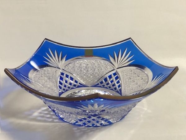 - ◎HOYA 保谷 色被せクリスタル 金縁 江戸切子 23cm五角形菓子鉢 「菊つなぎ紋」◎z56